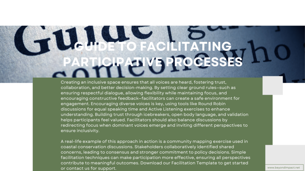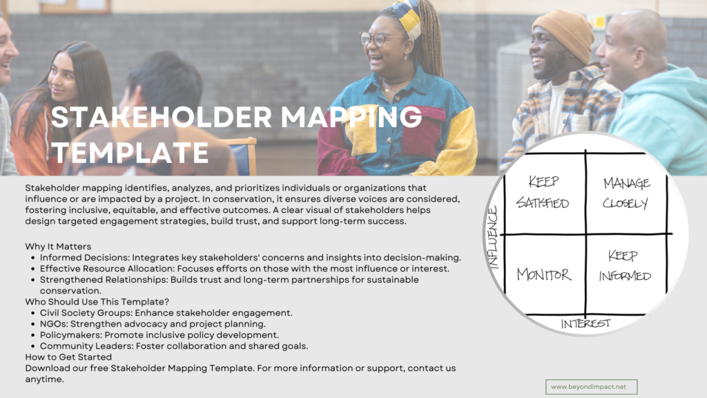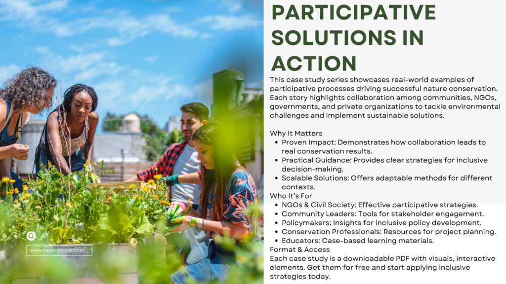 That’s where Beyond Impact comes in. We empower you with the resources, frameworks, and insights needed to facilitate participatory processes, engage stakeholders effectively, and drive real change in conservation and sustainability efforts. These free resources are designed to cut through the complexity and give you practical, actionable tools.
